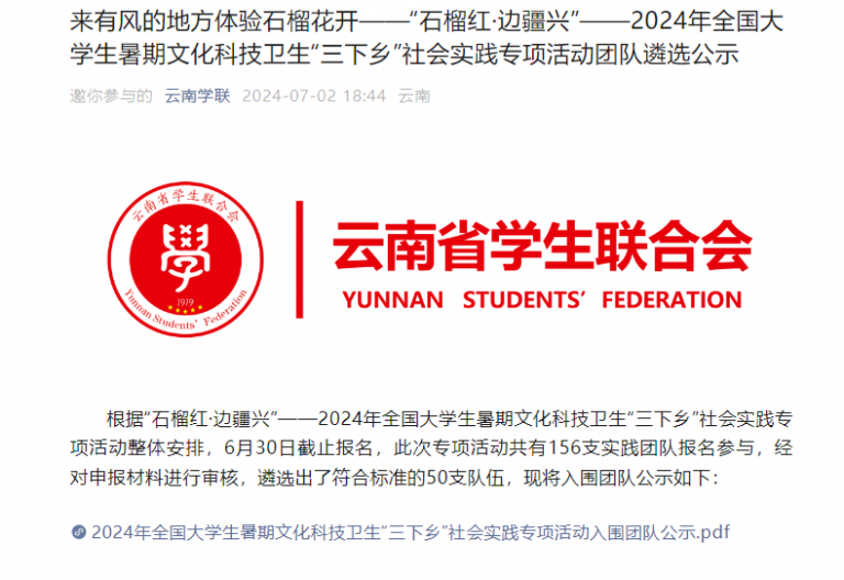 7月2日,共青团云南省委公布了“石榴红 边疆兴”—2024年全国老员工暑期文化科技卫生“三下乡”社会实践专项活动志愿服务队入选名单,9728太阳集团(艺术博物馆)“兿树石榴红实践团”在全国156所高校中脱颖而出,成为学校唯一成功入选团队。