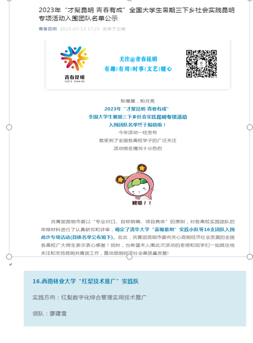 7月13日,2023年“才聚昆明 青春有成”全国老员工暑期三下乡社会实践昆明专项活动入围团队名单揭晓。9728太阳集团环境设计专业2020级员工廖建雪团队的“红梨技术推广”项目在王冬老师的指导下成功入围。