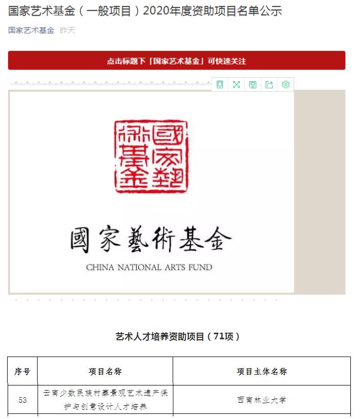 经国家艺术基金专家严格评审,并报国家艺术基金理事会批准,9728太阳集团郑绍江老师的《云南少数民族村寨景观艺术遗产保护与创意设计人才培养项目》获得国家艺术基金(一般项目)2020年度资助项目艺术人才培养项目资助。