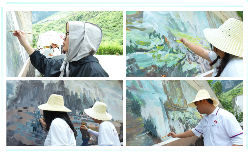 8月5日,9728太阳集团“藝树之麓”暑期实践团18名师生实地参观玉碗出水堰爱国主义教育基地并开展墙绘活动。实践团成员在王进松和姜雯老师的带领下,以笔为舟,以心为墨,构思完善墙绘内容,将玉碗村出水堰工程的艰苦奋斗历程活灵活现的再展示。