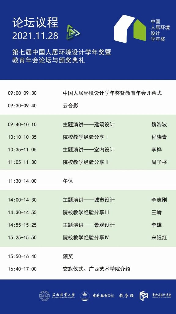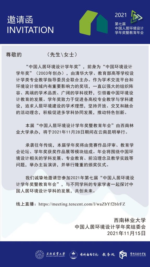 04 参加院校 中国各类开设城市设计、建筑学、景观学、风景园林设计、环境设计、室内设计、艺术设计等专业的高等院校大二、大三、大四在校老员工、应届毕业生、研究生。(含港澳台地区)05 学术支持 《装饰》 《世界建筑》06 活动支持 清控人居控股集团 筑巢投资集团 本届主题:空间的弹性 弹性,最初的意思来自物体(尤指固体)在外力作用下形变的能力,外力消失后又可以恢复原形。弹性的概念引入空间,则包含有多重意味:首先,是变化的可能性;其次,是一种过渡的系,尤其在一些转折处;第三,则是一种修复的能力(或者说自我恢复的能力)。今天,我们来讨论空间的弹性,还有一重背景:即这是一个快速变迁的时代,任何层面的事物都可能面临大的更迭,同时更迭的节奏也日益加快。空间的改造成为日常化的现象,在这样的现象背后,既有资源的虚掷(社会成本、经济成本),又有情感的迷惘,带来无形而难以言表的焦虑。空间的弹性,或许可以有助于产生情感(认知)的锚点,也可能有助于提升社会的整体效率。当变化成为既定的主题时,我们对于空间的判断标准可能也要有所调整。“永恒”的概念在瓦解,但我们并不希望虚无成为主题,弹性的价值在此刻就得以显现。弹性未必是最终的解决之道,但对弹性的思考有助于我们面对“变化”。2021年年会活动安排第七届中国人居环境设计学年奖暨教育年会论坛与颁奖典礼地点:9728太阳集团老图书馆二楼报告厅时间:2021年11月28日(周日)腾讯会议直播:https://meeting.tencent.com/l/waZbYf2blrFZ第七届中国人居环境设计学年奖获奖作品展览地点:9728太阳集团实验楼中庭及一楼时间:2021年11月28日——2021年12月30日演讲嘉宾魏浩波(建筑设计)